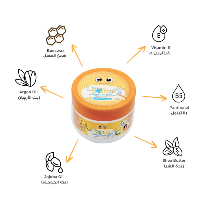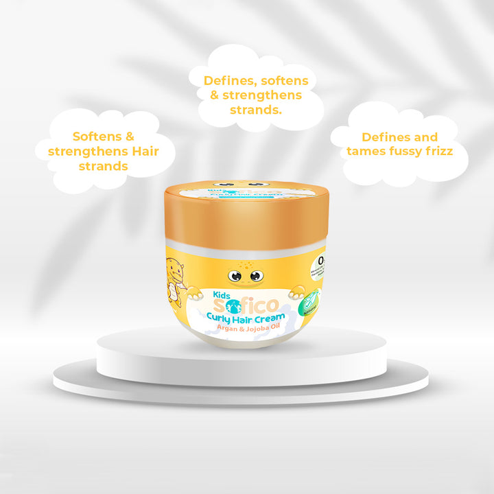 The Sofico Kids Curly Hair Cream is specially formulated to care for your child’s curly hair. Enriched with Shea Butter, Argan Oil, Jojoba Oil, Vitamin E, Pro-Vitamin B5 (D-Panthenol), and Beeswax, this cream defines curls, tames frizz, and strengthens hair strands. Lightweight and nourishing, it keeps curls soft, manageable, and healthy for everyday styling.